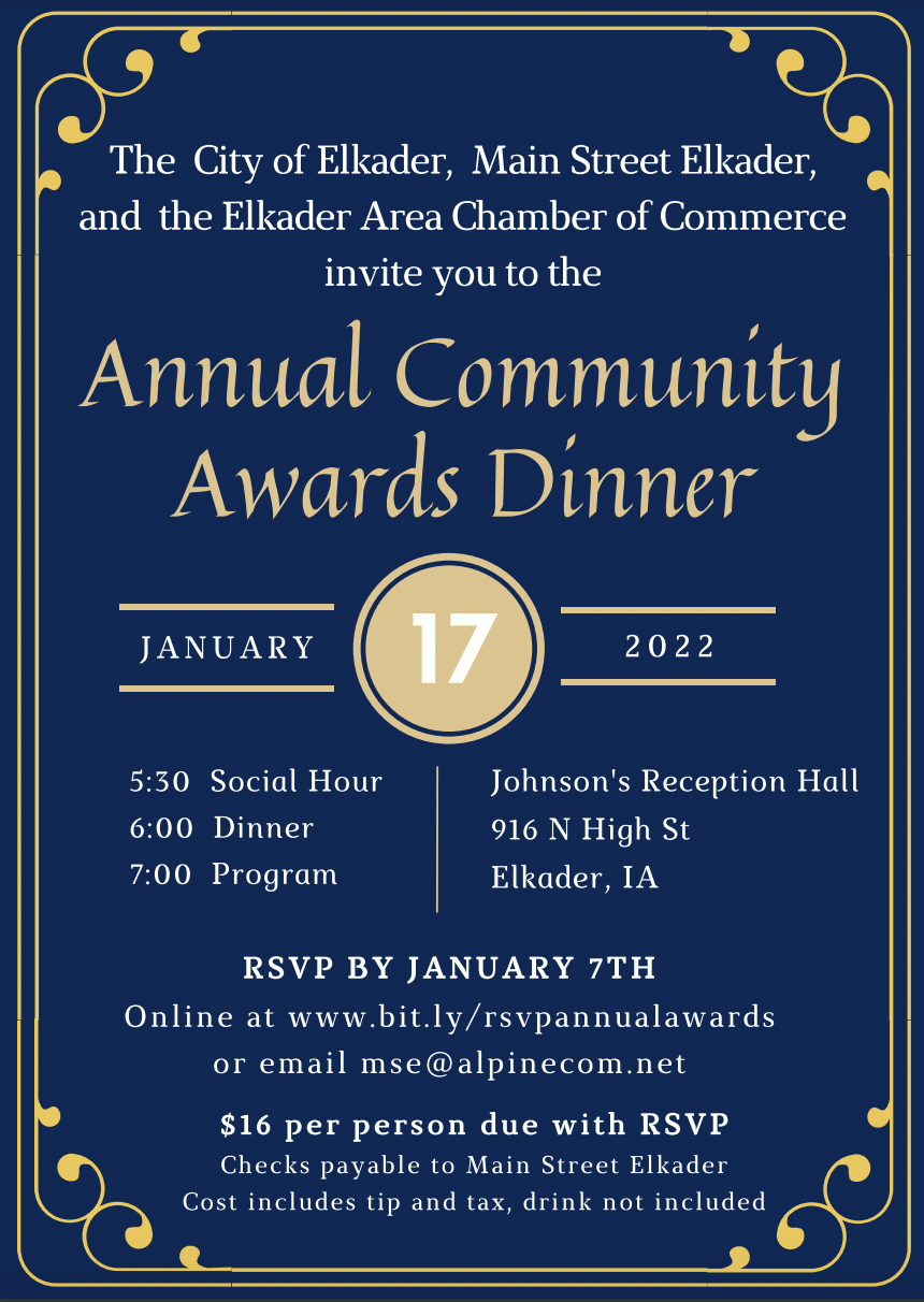 Please save the date for the upcoming Elkader Annual Community Awards Banquet on January 17th at Johnson's Reception Hall. A social hour will begin at 5:30pm followed by a meal from Johnson's Restaurant and Reception Hall. The awards presentation will begin at 7:00pm. We have a lot to celebrate since the last time we were […]