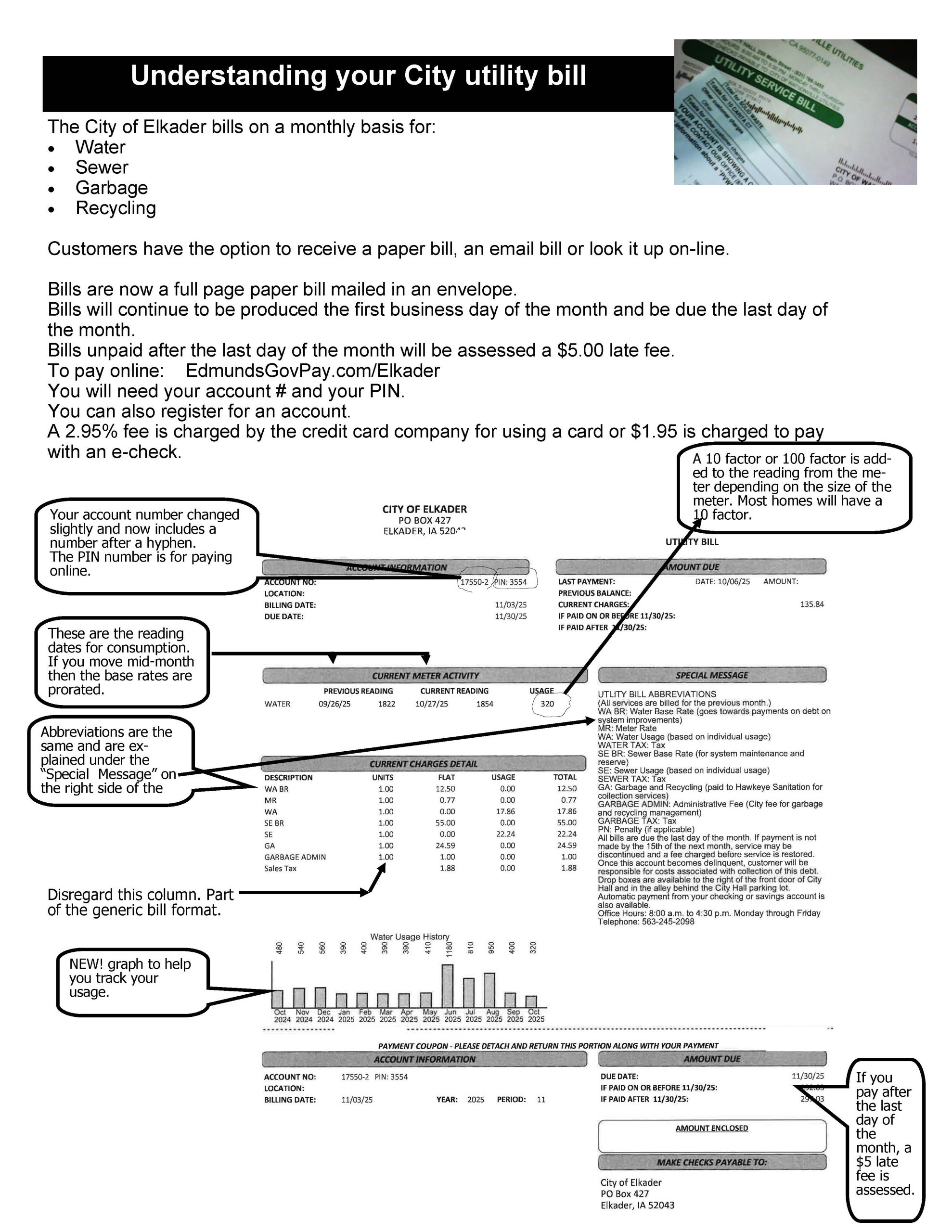 For the utility bills mailed on October 1st, the readings for consumption (or usage) are for a longer period of time. Therefore the amounts attributed to the WA and SE codes on your utility bill will be more than typical. The charges for consumption will be for roughly six weeks instead of four weeks.