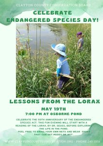 Celebrate Endangered Species Day with Lessons from the Lorax at Osborne Pond on Friday, May 19th. Meet at 7p.m. at Osborne Pond. All ages are welcome at this fun family event.