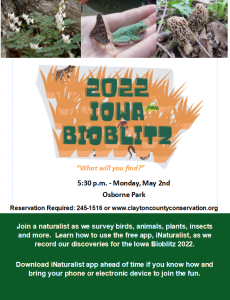 Iowa Bioblitz 2022 will bring together citizen scientists across the state to observe as many species as possible during the 1st week in May. Lend us a hand here in Clayton County as we attempt to find, identify and record as many species as possible during this statewide effort. Come learn how on Monday, May 2nd at 5:30 at Osborne Park when we will pair technology and ecology using the iNaturalist app.