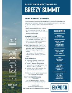 “This is a unique opportunity for families and builders to invest in Elkader’s future,” said Mayor Josh Pope. “The addition of 11 homes in Breezy Summit will strengthen our schools, our businesses, and our quality of life.”